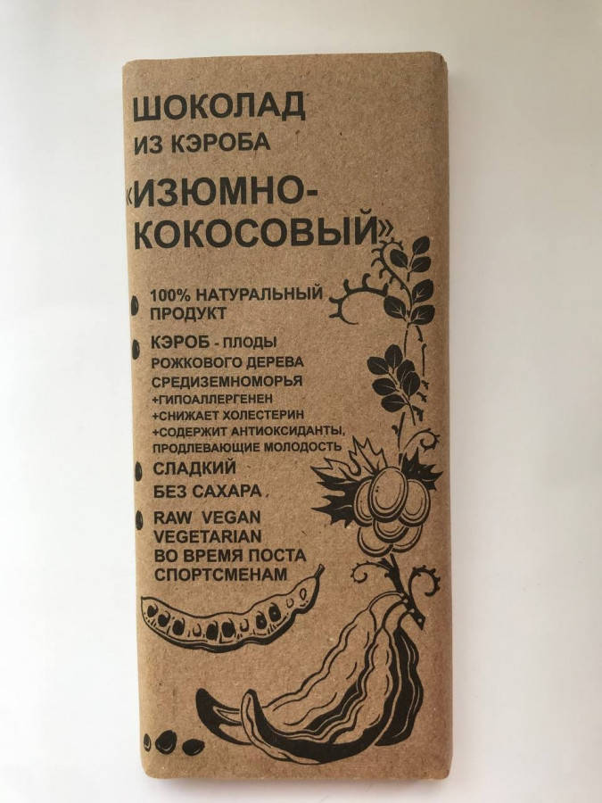 Состав: какао-масло холодного отжима, кэроб сырой, кокосовая стружка, изюм.